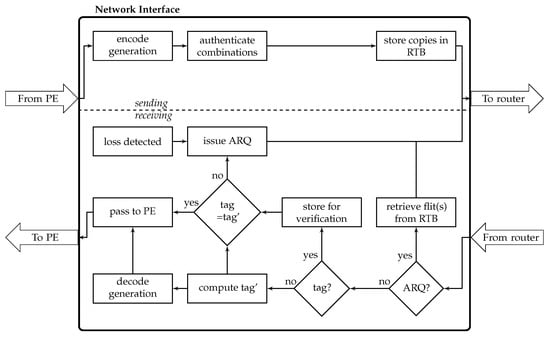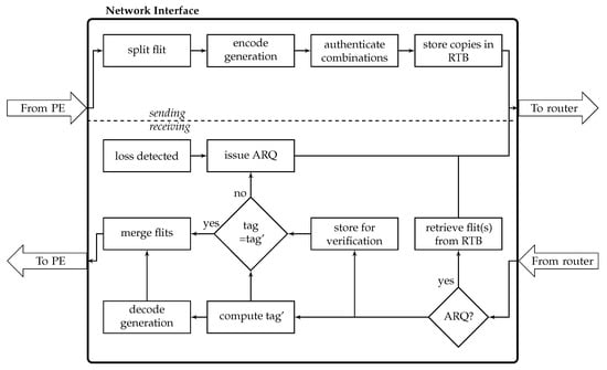 When the receiver gets a data flit (i.e., a linear combination), it starts the computation of the tag. After successful verification of at least G combined flits, decoding starts. Finally, the decoded flits are delivered to the PE. Due to the redundancy, decoding may still be possible even if modifications are detected. For example, if 2 of 4 received combinations failed verification, decoding is possible if the remaining 2 combinations are unmodified. If there are not enough valid combinations, the receiver issues an ARQ for both data and tag flit.