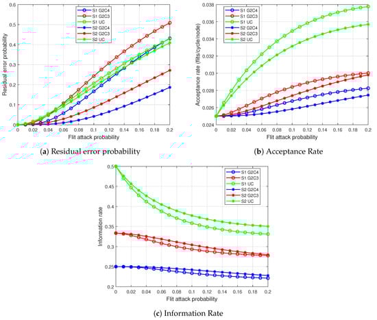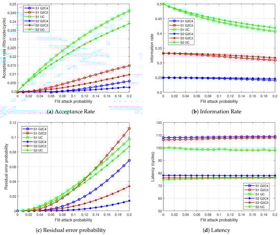 Since there is a significantly higher probability of passing through an attacking router in the NoC, we can expect significantly higher rates of flit drops and modifications. As a result, residual error rates (Figure 6a) are considerably higher in comparison to the NoC. Similar to the performance for NoC, in the NoC S2 behaves better than S1: S2/G2C4 has less than half the residual error probability of S1/G2C4 at 0.2 flit attack probability. For G2C3, S1 has a higher residual error probability than S2 at attack probability. For UC case, the performance of S1 and S2 are similar, which is already expected from Equations (8) and (23). In S1, it is observed that the redundancy of NC is no longer sufficient since at the high attack rates it becomes less likely to receive G pairs of unmodified flits, resulting in a worse performance than UC. At attack probability G2C3 has a higher error rate and G2C4 has approximately the same error rate as UC.