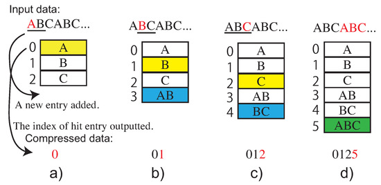In the 1970s, an algorithm based on look-up table that registers frequent symbols was proposed. A typical implementation was LZW (Lempel-Ziv-Welch) [9,10] instantiated on Zip, LZ4 [11], Snappy [12], and deflate [13]. The algorithm compresses one or more frequent symbols by using a look-up table. The look-up table maintains the frequent symbol patterns and the compressed symbols are translated as the table indices. This kind of algorithm that uses a look-up table is called digram coding. For example, Figure 1 shows examples of compression/decompression processes of LZW. It compresses an ASCII character pattern “ABCABC”. In LZW, first, the table is initialized by available symbols appearing in the patterns. Typically, a table entry has a 12 bit symbol and the first 256 entries are configured to the corresponding binary bits. The compressor has a rule that a new pattern with the subsequent symbols is added to the table. While a pattern is hit in the table, the associated index is outputted. Here, to explain simply, the example initializes the table with ‘A’, ’B’ and ‘C’ first as shown in Figure 1a. The first ‘A’ hits in the table. Then, “AB” is tried if it is hit or not in the table. However, it misses. Therefore, ‘A’ is translated to the index ‘0’ with bits where k is the maximum number of entries in the table. The pattern “AB” is added to the table. The ‘B’ is converted to ‘1’ as depicted in Figure 1b. With the similar operations, “ABC” is added to the table and the compressor outputs ‘2’ as shown in Figure 1c. After that, as illustrated in Figure 1d, “ABC” is hit in the table and the compressor outputs ‘5’. This results “0125”. If the table index is 3 bits, the original data pattern is compressed from 48 bits to 12 bits. In the decompressor, the table is initialized as well as the compressor. During accepting the indices of compressed data, the decompressor adds new patterns to the table as well as the compressor. The compressed pattern can be decompressed to ‘A’, ‘B’, ‘C’, and “ABC”.