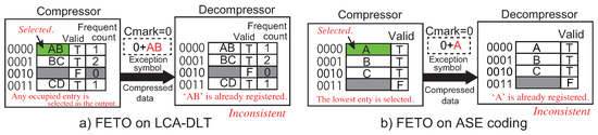 The implementations of FETI differ depending on the algorithms, especially depending on the table management. For example, in the case of LCA-DLT as shown in Figure 9a, the compressor needs to search an unoccupied entry in the look-up table. Here, the compressor can choose any unoccupied entry that the valid bit is reset, and outputs the index as a compressed data with Cmark = 1. The decompressor receives the compressed data and tries to pick up the original symbol from the look-up table. However, the entry pointed by the index is not occupied. This is inconsistent and causes an exception. Note that in LCA-DLT, we cannot apply FETI when the table is full. On the other hand, in ASE coding, we need to implement FETI with a care for the table management operation. FETI is not available when the number of occupied entries equals where . For example, when the number of occupied entries in the look-up table is 16 (the total number of entries initially allocated in the table is more than that), if the compressor generates an exception symbol, it can choose the index of the 17th entry in the table. However, the number of occupied entries does not change. Therefore, the entropy calculation returns and the compressor shrinks the exception symbol to 4bits. However, the number of bits to express the exception symbol (i.e., 16) is five. This lacks a bit of the exception symbol. Thus, FETI does not work in some conditions depending on the number of occupied entries. To avoid this situation, the compressor should activate FETI only when the look-up table is empty. Under the condition when the number of occupied entries in the look-up table is zero, the compressor can simply select the lowest index (i.e., 0) as the exception symbol and outputs it. Due to the entropy calculation when the table is empty, the compressed data is always a single bit consisted of Cmark = 1 only. Here, the compressor can ignore the index selection and just can output Cmark bit. When the decompressor receives the compressed data, it detects the Cmark and extracts the number of bits due to the entropy calculation as well as the one in the compressor. Then, the table index becomes zero. The lowest entry in the table is selected. However, it is not occupied. This is inconsistent in the decompression algorithm and thus, an exception has occurred. Now, let us see a case when several entries are occupied in the look-up table as shown in Figure 9b). In this case, the entropy calculation results . The index 0011 is selected as an exception symbol because it is not occupied and is placed in the lowest. It is shrunk to 11 and Cmark = 1 is combined. In the decompressor side, the compressed symbol is recognized and the index 0011 is referred. However, it is not occupied. Thus, the exception occurs.