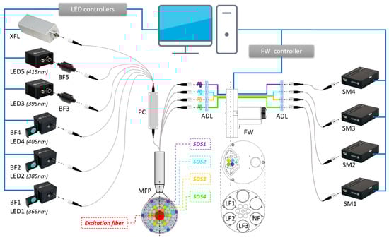 General scheme of the SpectroLive device optical principle. XFL: xenon flash lamp for broadband diffuse reflectance (DR) measurements; LEDi (i ∈ {1,2,3,4,5}): light-emitting diodes for narrow band together with BFi excitation bandpass filters for narrow-band autofluorescence (AF) excitations; MFP: multiple fiber probe (see details in Figure 2); PC: power combiner; ADL: achromatic doublet lens; FW: filter wheel; SDSj (j ∈ {1,2,3,4}): source-to-detector separations; LFk (k ∈ {1,2,3}): emission long-pass filters; NF: neutral density filter; SMj: spectrometers.