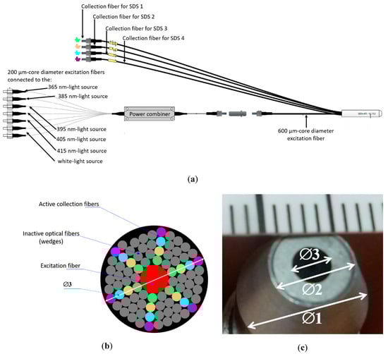 Optical probe used in the SpectroLive device. (a) General schematic of the entire probe including excitation fibers each connected to one of the six excitation light sources, merged into a single 600 µm-core diameter excitation fiber and collection optical fibers, each connected to a spectrometer, each corresponding to a specific source-to-detector separation (SDS). (b) Schematic of the optical probe showing the 84 optical fibers around the central excitation fiber (600 µm-core diameter): 60 grey optical fibers are inactive and used as wedges for the 24 active collection fibers shown in the figure as colored fibers. The green (respectively orange, blue and purple) ones correspond to first SDS1 (respectively SDS2, SDS3 and SDS4). For each colored ring, the six fibers are merged into the collection fibers. The diameter of the whole section is 3.5 mm. (c) Picture of the probe end: outer diameter ∅1 is 10 mm, tip diameter ∅2 is 6.5 mm, and fiber optics area measurement diameter ∅3 is 3.5 mm.