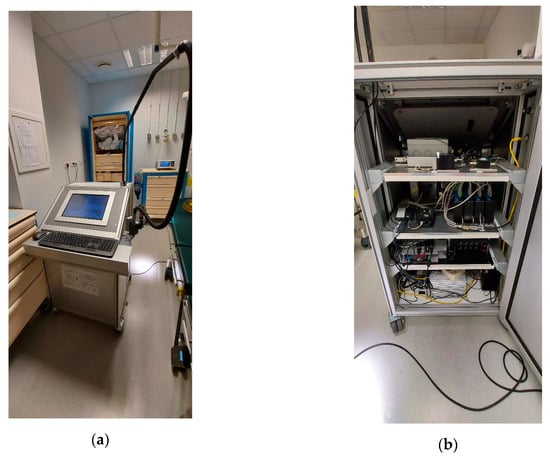 SpectroLive device in a surgery room at the Metz-Thionville regional hospital. (a) Front view showing tactile screen, keyboard, the pole holding the optical fiber probe and its holder (right side). (b) Back view: top shelf, light sources; second shelf, spectrometers and filters wheel; 3rd shelf, LEDs controllers; bottom shelf, computer central unit and electrical filter.
