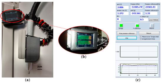 Probe pressure control module. (a) General view of the module fixed onto the optical probe of the SpectroLive device. (b) Screen fixed onto the optical probe so the user may see it while measuring, displaying the pressure level within (green graph) or outside (orange graph) pre-defined boundaries. (c) Human–machine Interface monitoring the probe pressure during the whole spectra acquisition duration: the red and blue lines respectively show the maximum and minimum pressure level previously defined by the user.