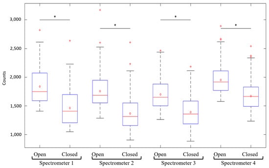 Boxplot (n = 5) of the photon count values measured for background (spectrometer’s entrance left “open” connected to the collection fiber) and dark (spectrometer’s entrance “closed” with a black cap) noises for each of the four spectrometers used on the SpectroLive device. Stars indicate significant statistical differences.