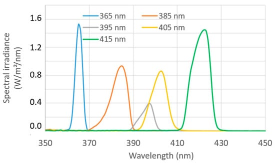 Emission spectra of LEDs used for autofluorescence excitation on the SpectroLive device measured using the Specbos 1211 (Jeti®) spectroradiometer.