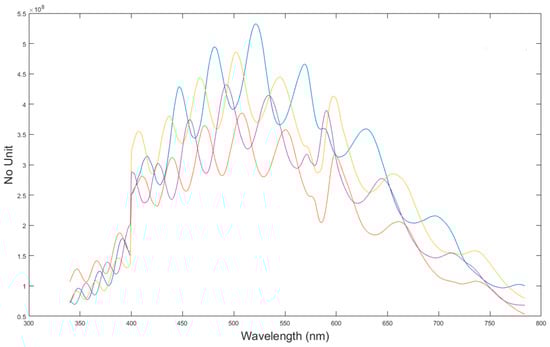 Figure 8 shows one example of a spectral correction curve (CSDSi for i = 1–4) for the DR measurement (FW = no filter) used to correct intensity raw spectra acquired by spectrometers SM1 (blue curve), SM2 (red curve), SM3 (yellow curve), and SM4 (purple).