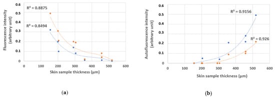 Figure 9a shows that the fluorescence can be detected for thicknesses lower than 500 µm. For thicker skin samples, fluorescence from underneath the skin samples is no more detected. As expected, the fluorescence intensities measured for the 405 nm-excitation peak are greater than the ones measured for the 365 nm-excitation wavelength.