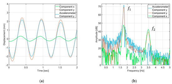 Figure 9a shows the displacement. The signal from the accelerometer (the light-blue dotted line) was double integrated and filtered between and . The red and green lines are the y- and x-components of displacement retrieved by radar using (4) and filtered between and .