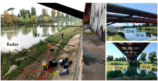 Figure 11 shows the setup for this measurement. The main radar was installed close to the abutment of the right pillar, while the additional antennae were on the pillar. The radar was in the center of the span. Table 3 shows the position of the radar, of the second pair of antennae, and of the two targets considered for the analysis. The targets are also highlighted with red points in Figure 10. The targets were selected using the method described in [10,11].
