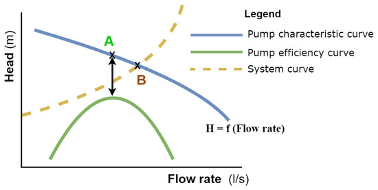 Two working points must be taken into account in pumping systems: the maximum performance point (A) based on the pump’s characteristics and the working point or flow rate provided by the pump (B). The aim is to get points A and B as close as possible to increase the pumping efficiency. Thus, for a certain number of revolutions, the pump’s characteristic curve relates the head, efficiency and power to the flow it has pumped [28]. Therefore, water consumption is directly proportional to energy consumption, and less energy is consumed for the same flow, the more efficient our system will be.