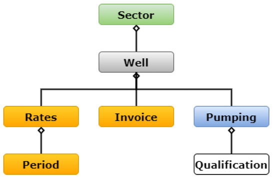 The data model focuses on the management of pumping in water user associations, which are usually made up of a set of irrigation sectors to improve water distribution, Sector. In turn, each sector is generally associated with irrigation well, Well. The information on the wells is marked by three pillars, which allow them to be defined univocally:
