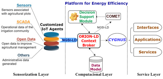 Figure 3 shows the layered architecture proposed to improve irrigation wells’ energy efficiency in an intelligent agricultural environment. The architecture integrates from the deployment of sensors and monitoring of data extraction techniques to the intelligent processing of information. These layers are based on open and standard initiatives such as those provided by the FIWARE Community.