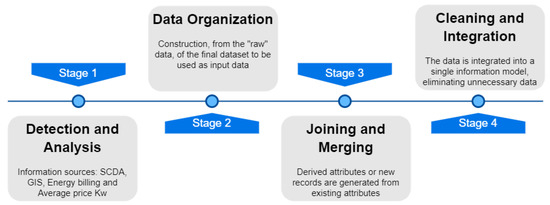 The last stage (Cleaning and Integration) focuses on combining the data sets that are scattered across different sources (energy bills and electricity tariffs), making aggregations that summarize the information in various records, and removing the data that generate “noise” due to the failure of data reception. All the data are also integrated into a single information model by making syntactic modifications to the data without altering its meaning.