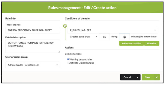 After integrating the data sets, the optimal working thresholds of the wells are defined (with the collaboration of the responsible technicians), based on the calculated EEP indicator: Optimal (greater than 70%), Normal (between 60% and 70%) and Out of range (below 60%). After establishing the efficiency thresholds, rules are defined to warn of abnormal performance. If a well falls below 45% during the day, a warning is generated, and the pump is stopped. Figure 6 shows how the alerts are created; in this case, it is activated when the pumping efficiency indicator is below 65%, for 60 min (so that technicians can be alerted in time to take preventive measures).