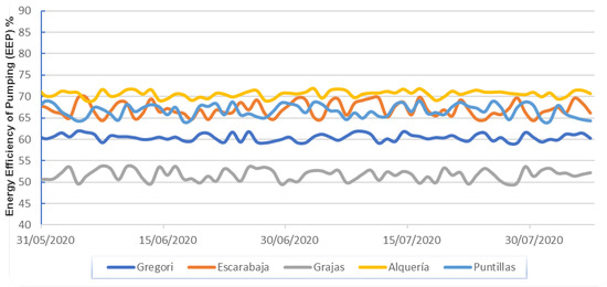 From the control and supervision of its five agricultural pumps studied, different results have been obtained. One fact to bear in mind when considering the wells’ performance is that the more significant the difference in height at which the pumping is carried out, the lower the flow rate will be due to the increase in the water column’s meters that the pump must overcome. On the contrary, the more similar the suction and expulsion points are in terms of height, the greater the flow obtained, as in the Alquerías well. In Figure 7, we can see the evolution of the daily performance of the pumps m/kW/h or (benefit obtained/effort used), observing anomalies in two pumps, based on the EEP indicator: Grajas whose values are below the minimum recommended, and Gregori which tends to have values close to 60% indicating that their performance tends to decrease. These values indicate the need to assess the reasons for this fall in order to avoid raising the cost of water extraction.