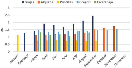 As for the cost of water extraction based on the energy bill generated by each well, the diagram in Figure 9 shows the average monthly price for extraction per m of water. During the last agricultural campaign, and thanks to the system’s data, we observe that the average cost of pumping water is 0.87 €/m/month. This value is high due to the extra cost produced in two wells, Grajas and Gregori with an estimated cost of 1.17 €/m/month and 1.03 €/m/month. This average cost can be reduced by around 23%. During the months of highest water consumption, corrective measures are taken once critical values generated by the monitoring and integrating the different inputs that define the pumping efficiency are alerted.