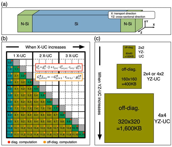 - The nanostructure has 8 × 16 unitcells on the YZ([0 1 0] and [0 0 1])-plane. Since we use a 10-band tight-binding model and a single [1 0 0] unitcell has 2 atoms per atomic layer, the size of a sub-matrix becomes 2560 × 2560 (= 16 × 8 × 2 × 10).