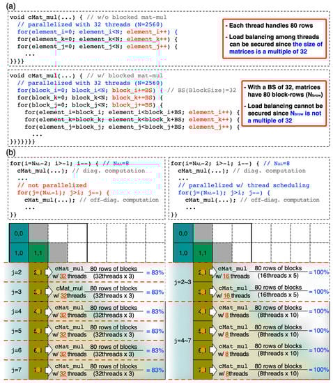- The 4 iterations of j-loop (j = 7→6→5→4) are executed simultaneously with 4 threads, and cMat_mul is processed with 8 threads (32/4 = 8). In this case, all the 32 (4 × 8) threads execute matrix multiplication simultaneously, and the issue of load imbalance does not exist since 80 rows are processed in parallel with 8 threads.