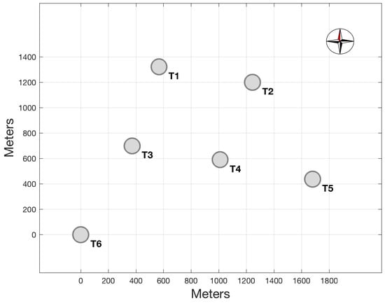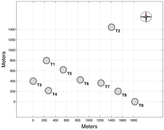 The selected test cases were two wind farms (named as WF1 and WF2) sited in southern Italy on gentle terrains, featuring respectively six and nine wind turbines whose rated power was 2 MW. The rotor diameters at WF1 was 92 m and at WF2 was 82 m. The layouts are reported in Figure 1 and Figure 2: from these Figures it arises that the interturbine distance at WF1 was considerably higher with respect to WF2. Therefore, the impact of wakes on wind turbine operation was low for WF1, while it was relevant for WF2 (as discussed, for example, in [38,39]).