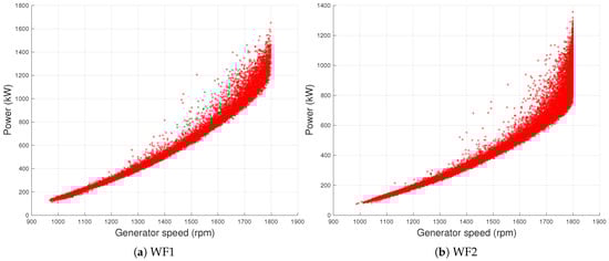 Examples of the operation curves under analysis were reported for a sample wind turbine (T1) for each test case in Figure 3 (generator speed-power), Figure 4 (rotor speed-power) and Figure 5 (blade pitch-power): from these Figures, it arises that the curves were qualitatively similar and therefore the logic of the control was the same.