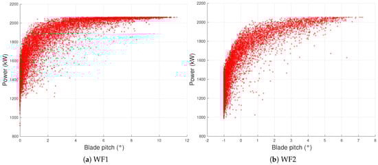 An example of blade pitch-power curve for T1 in WF1 and WF2.