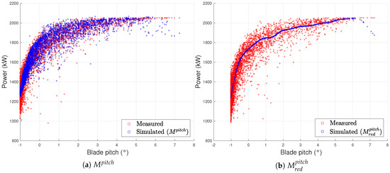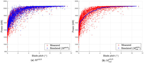 Measured and simulated blade pitch-power curves: D2 data set, T1 wind turbine. model on the left, on the right.