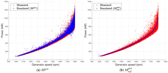 In Figure 6, Figure 7 and Figure 8, examples of measured and simulated curves are reported. The results for the complete models M are reported on the left, while on the right the results for the corresponding reduced models are reported. A sample wind turbine (T1) was selected and the employed data set was the validation one (D2). As regards all the curves, it arises that the full models M were more capable of reproducing the actual dispersion of the measured curves: therefore, the inclusion of the minimum, maximum and standard deviation of the input as further covariates for the regression proved to be decisive for a more realistic modelling of the curves.