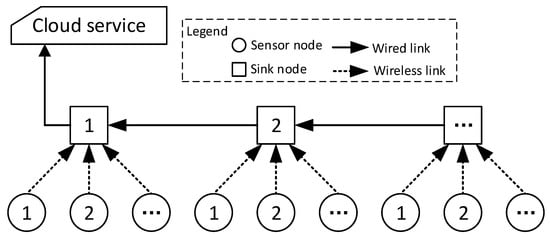 Figure 1 shows a typical data transmission model of IoT in underground mining. There are three types of equipment for the IoT in underground mining: cloud server, sink node, and sensor node. A sensor node collects all kinds of environmental data according to requirements. There are many different types of sensors, and the data of these sensors are heterogeneous. The data that are collected by the sensors will be sent to the sink node through the wireless link. A sink node can usually receive the data sent by multiple sensors, and then forward these data to the cloud server through a wired link (because the sink node in underground mining is deployed according to the tunnel structure. Therefore, chained topology is a common structure [28]). The cloud server stores the received data, and then analyzes and processes it as needed.