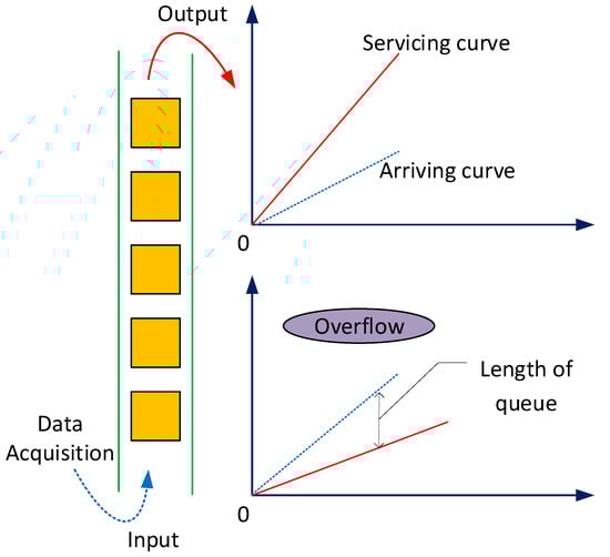 In order to perform cluster analysis for multiple data, the sensor node uses a data buffer queue to store the data, and then after analysis, it is sent to the sink node. Figure 3 shows the sensor data cache queue. Periodically collected data will enter the queue, and then is sent to the sink node according to the sending rate. The right part of Figure 3 shows the queue input and output in two different situations. The red solid line is the queue output curve, and the blue dashed line is the queue input curve. According to the network calculus theory [31], if the slope of the service curve is greater than the arrival curve, then the queue will work normally. Otherwise, the data in the queue will remain. Overflow will occur when the remaining amount is greater than the queue length. For any sensor i, the length of the data queue is , and the number of data packets collected in each cycle is , then we have and . The data acquisition frequency is , then we have . Assuming that the unit execution time of cluster analysis is , according to the curve shown in Figure 3, we have , that is,