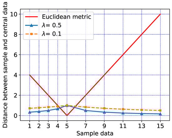 where, is a parameter that indicates the bound on the data values of different types of sensors. The black solid line represents the direct error value between the sample data (1, 2, 3, 4, 5, 7, 9, 11, 13, 15) that is obtained according to the Euclidean distance and center data 5, as shown in Figure 4. It can be seen that, with 5 as the dividing line, it presents a very obvious trend of phenomenon changes. In actual engineering projects, the distance of the data value may not be so obvious, and it can be dynamically adjusted according to the engineering requirements, so the use of the value can solve this problem well. The blue triangle curve and orange square curve shown in Figure 4, respectively, represent the changes in the membership degree of the sample data and the center data under different values ( = 0.5 and = 0.1).