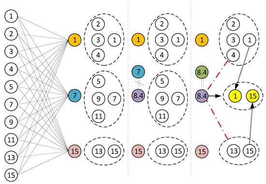 Figure 5 is an example of the clustering algorithm of the sensor node. There are a total of 10 data [1, 2, 3, 4, 5, 7, 9, 11, 13, 15], and the parameters of the algorithm are set . Finally, the abnormal data were deleted [1, 15].