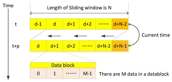 For a certain type of sensor, at every interval p (p is the data acquisition period of the sensor), the sink node will receive new data. At this time, the sliding window needs to be updated in order to ensure that the data on the right of sliding window(see in Figure 6) is the latest data. At each moment, the data block in the sliding window actually contains the data values of M different sensors.