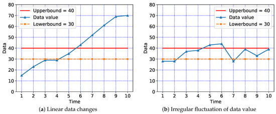 It can be seen from Figure 7a that, if the data for a period of time increases or decreases linearly, it can be regarded as abnormal. However, in many cases, the curve of the data is an irregular fluctuation, as shown in Figure 7b. Therefore, it is difficult to judge the trend of such irregularly fluctuating data. Neural network (such as BP neural network) is an effective method, but, due to the limited hardware performance of the sink node, complex algorithms cannot be executed. For this reason, this paper proposes an approximate trend estimation algorithm, which analyzes the difference between adjacent data.