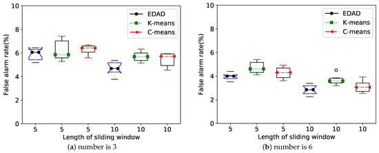 Figure 8a is the analysis result of the false alarm rate of abnormal data of three sensors, respectively, testing the false alarm rate under two sliding windows of five and 10 different lengths. Obviously, with the length of the sliding window increases, the overall false alarm rate decreases. It means that the length of the sliding window is of great significance to the accuracy of the system. The longer the sliding window, the more data can be referenced, and the higher the overall accuracy. Figure 8b is the data analysis result of six sensors. Obviously, the larger the amount of sensor data, the higher the overall accuracy. When comparing three different algorithms, the algorithm of Edge-computing Data Anomaly Detection (EDAD) that is proposed in this paper is better than the other two algorithms in accuracy, especially when the number of sensors increases. In contrast, the accuracy of the C-means algorithm is better than that of the K-means algorithm, although the gap is not obvious.