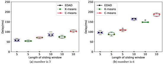 Figure 9a,b test the delay changes under different sliding window lengths. Contrary to the false alarm rate, as the number of sensors and the length of the sliding window increase, the delay gradually increases. Because it takes more time to process more data. By comparison, it can be seen that the proposed EDAD algorithm has a smaller delay than the K-means and C-means algorithms. Although, in the case of a large amount of data (increasing the length of the sliding window or increasing the number of sensors), its delay has also increased significantly, but, under the set experimental conditions, the delay can be controlled at a hundred milliseconds, which is sufficient for the requirements of the engineering application in underground mining.