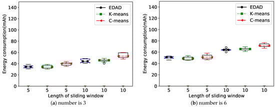 As the window length increases and the number of sensors increases, the times of data calculation also increases, so the device consumes more power, as shown in Figure 10. Additionally, it can be seen from the figure that the energy consumption of the three algorithms is not much different. This is because the experiment time is short (200 data is about 1 h), and the measurement may also cause errors due to the instrument. There is a certain gap in the actual energy consumption value. Nevertheless, it can be seen that the algorithm that is proposed in this paper consumes less energy than the other two algorithms.