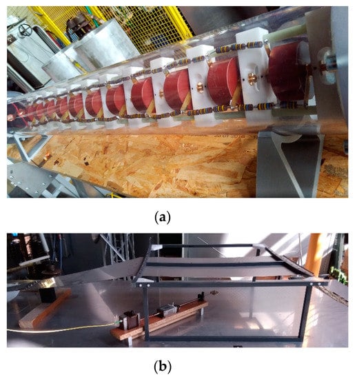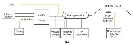 Since the voltage measurement of hundreds of kilovolts and rise times of the order of nanoseconds are not feasible with classical voltage dividers, the measurements of the output pulse were measured indirectly—by measuring the field strength on the stripline connected to the generator output (Figure 2b). The dimensions of the line were as follows: length: 1 m, width: 0.48 m, height: 0.3 m, while the total impedance was equal to 130 Ω. A Montena SFE3-5G probe (Montena, Rossens, Switzerland) was used to measure the electric field strength in the stripline space, which can measure pulses with rise times from 110 ps.