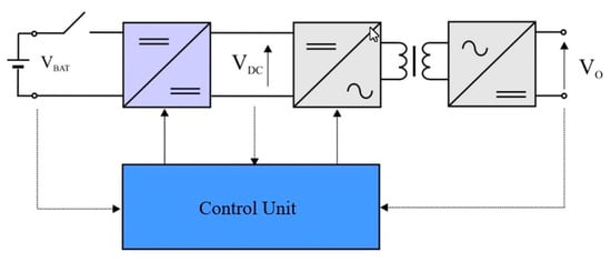 The proposed solution was based on the two conversion stages presented in Figure 3. The second stage is an isolated series resonant DC-DC converter operating with a fixed voltage gain (G = 125) up to 50 kV, while at the input, a non-isolated DC-DC converter is connected. This converter plays the role of a regulated voltage source with the reference voltage proportional to the expected value of the output VO. This approach is more convenient than the complex control of the series resonant DC-DC as precise adjustment of the voltage up to 400 V is less complex. Thus, the reference voltage VDC was set according to the reference VO and the ideal gain G. Then, on the basis of the isolated measurement of the output voltage VO, which was designed to be isolated from the controller and, in consequence, is rather slow, necessary corrections of the VDC were also introduced. This approach was necessary due to variations in the gain of the isolated DC-DC converter with the load changes. Moreover, the voltage of the battery VBAT may also drop with the current. All in all, the proposed solution is simple and easy to manage at high operation frequencies and the output voltage is properly controlled according to the Marx generator’s needs.