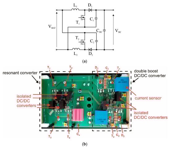 To control the input current drawn from the battery, the main circuit was also equipped with two current sensors (LA 25-NP) (LEM USA Inc., Milwaukee, WI, USA), and then the signal was transferred to the control board described in the following sections. Pads were attached to the midpoints of the branches, which enable the connection of the boost inductors of 30 µH/30 A max required in this topology. In parallel, two sets of capacitors, C1 = C2 = 40 µF/250 V and 4 × 2.2 µF/250 V, were applied. As can be seen, the high switching frequency, set to 100 kHz due to the outstanding performance of the SiC devices, enables a reduction in passive components necessary to provide a suitable DC voltage. Moreover, two phase legs operating with a phase shift ensure a very good quality of the input current drawn from the batteries. As the assumed gain of the DC-DC converter is high (up to 17), the duty ratio varies from zero to 95% at nominal 400 V (Table 1).
