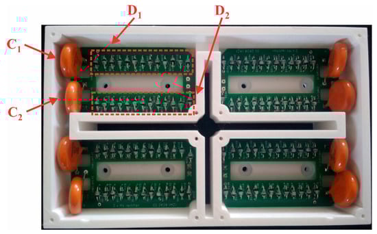 High-voltage rectifiers are an important part of the output stage, operating at voltages up to 50 kV. In this prototype, three half-bridge rectifiers with the neutral point of the capacitive divider were used in series. Due to high-frequency switching and the low current at the high-voltage output, capacitors were 1 nF each, rated at 10 kV. As a rectifier diode, a series connection of 26 SF1600s (1.6 kV/1 A) was applied, which made it possible to block 1/3 of the rated voltage (50 kV) with a necessary margin—the photo of the rectifier is shown in Figure 6. This rectifier is designed to provide air isolation between key points in the circuit. Furthermore, to ensure adequate isolation, the target version was placed in epoxy resin—a view of the housing for 4 rectifiers, made on a 3D printer before pouring, is shown in Figure 6.