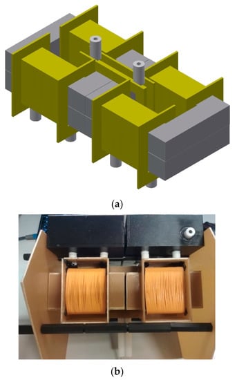 The transformer is equipped with a core, which is a set of 8 fittings (16 halves) of the U 80/49/20 core. The design of the magnetic element was conducted in such a way that the primary winding of the transformer includes 4 fittings with a total core cross-section SFe (N1) = 4 × 400 mm2 = 1600 mm2, while each of the four secondary windings is made on 2 cores with a total cross-sectional area of SFe (N2 ÷ N5) = 2 × 400 mm2 = 800 mm2—Figure 7. Each of the four secondary windings is connected to a rectifier through specially designed and made connectors with high breakdown strength.