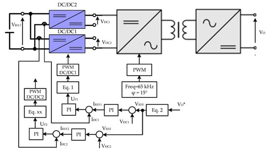 The basic assumption of the developed control system is to control two converter systems in such a way as to maintain the value of the output voltage VO * set by the user without exceeding the rated current at the input (battery) and in all components of the system. It is necessary to ensure cooperation of individual stages: the output, which is the resonant DC-DC converter with the high-frequency transformer, and the input double-boost converter that adjusts the voltage of the VDC intermediate circuit to the appropriately scaled voltage value at the VO output. In fact, the input stage consists of two voltage boost converters (Figure 4a). Each of them has a separate control system, consisting of an internal current control loop and an external voltage control loop (see Figure 8) with PI controllers. In order to reduce the non-linearity of the characteristic of the boost converter, especially at very high values of the duty cycle, the output signal of the PI controller of the current loop is converted according to