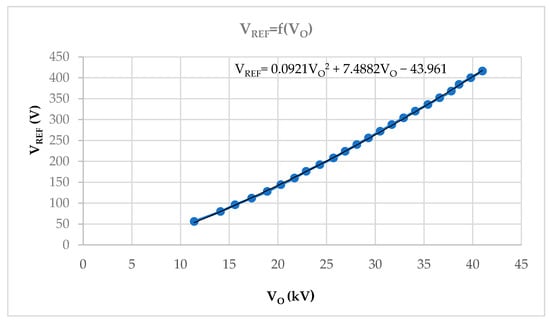 According to the assumed operation principles, the boost converter acts as a voltage source for the resonant DC-DC converter, which is operating at a fixed frequency and phase shift. However, the voltage gain G of the resonant converter is not constant and drops with the output voltage/power. Therefore, for the assumed range of the output voltage, the characteristics VREF = f (VO) were obtained on the basis of experiments and then used to determine the function correcting the set value of the output voltage. The obtained characteristic (Figure 9) was approximated by a third degree polynomial of the following form: