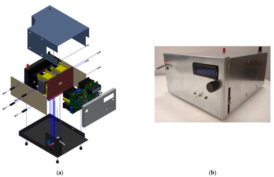 CAD drawing of the developed power supply (a) and photo of the finalized prototype (b).