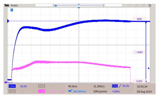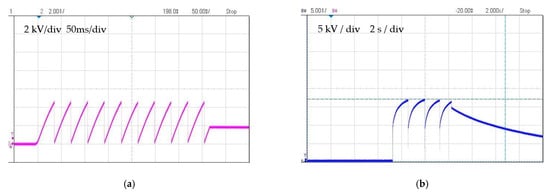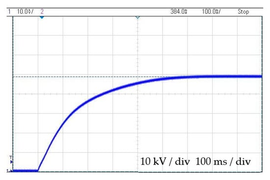 After initial tests including the operation of the two DC-DC converters separately and tests of the control system, the system was completed and mounted in the housing (Figure 11). Figure 12 shows the output voltage of the DC power supply without the external load, while the internal load is always the 48 MΩ resistive divider (the part of the VO measurements) designed to draw 1mA at the nominal output voltage. As can be seen in Figure 12, where the output voltage is presented, the DC supply provides a nominal voltage of 50 kV after 700 ms from the system start. Next, tests were conducted with an adjustable spark gap (see Figure 13) connected via a series resistor, and the DC supply was programmed to keep the voltage for a certain time period. During this time, the spark gap fired at a certain voltage level (5 kV—Figure 13a, and 16.9 kV—Figure 13b), reducing the voltage to zero, and then the supply was charging the voltage to the same critical value. This process was repeated several times, showing very good performance of the supply.