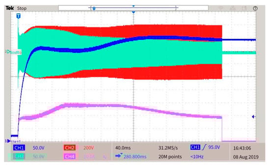 Finally, the portable DC supply was connected to the Marx generator in the setup described in Section 2. During the test, the generator was providing pulses counted in hundreds of kVs, resulting in strong electromagnetic fields emitted by the antenna. Thus, the whole device was controlled via fiber optic links, but the use of an oscilloscope and high-voltage probes near to the test setup was too risky. The performance of the DC supply was watched indirectly by recording voltage measurements in the microprocessor memory—the system was providing the requested voltage to the generator.