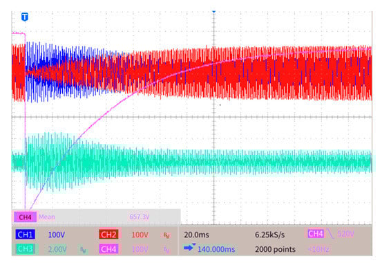 Next figures illustrate behavior of the DC-DC converters during both tests. The output voltage of the double-boost converter reaches nominal value after 320 ms, however, waveform shows two overshoots due to impact of the current controller (Figure 14). For this operation point a higher proportional gain of PI controller (Figure 8) would help to reach nominal current of 30 A faster but the same settings of the PI-controllers are expected to work properly also at low output voltages. Thus, the introduced settings and presented waveforms are a compromise, acceptable performance is observed for the whole operation range. As the resonant DC-DC converter operates with fixed frequency and phase shift, the peak value of inverter output voltage follows waveform of the VDC (Figure 15). From the same figure can be also seen that current of the resonant tank depends on the conditions in the inverter and transformer circuit, which is also visible in Figure 16 where waveforms measured after spark-gap discharge are presented. After rapid decrease of the output voltage, the converter is responding by means of increased resonant current and the output voltage is rising again to reach steady-state.