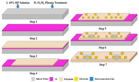 The fabrication schematic of the proposed flexible polyimide-based multichannel microelectrode arrays (MEAs).