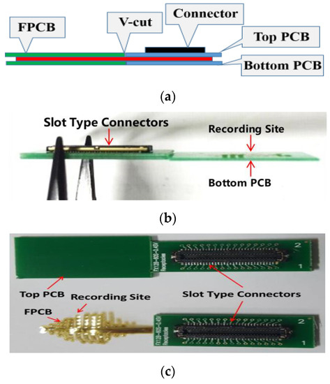The schematic plot (a), side view (b), and top view (c) of a fully assembled flexible MEA are shown in Figure 4. In total, 60 pins were led out from the slot type connector on the top floor and connected to the interconnection pads of the bottom flexible-PCB (FPCB) through vias, 30 of which were visible, while the other 30 vias were shielded by the installed slot type connector. The practical surface mounted device was fabricated with a slot-type connector without any additional bonding wires. This formation prevented the device from electrical interconnection failure, which could be caused by skull tissues during in vivo testing. The polyimide-based FPCB structure was used to support thin layer MEA electrodes and provided protection from physical damage. The top and bottom PCBs were processed with a connecter socket on the front side and interconnection pads on the backside. Similarly, the FPCB was connected with top and bottom PCBs through a V-cut, which can be easily removed during in vivo testing. Usually, the skull signal is recorded for a long duration, and sometimes several rounds of recording are executed to provide accurate and reliable measurement results. Therefore, the top PCB, bottom PCB, and slot type connectors were designed to be disassembled during the in vivo recording process. This innovative circuitry helped the potential patient to relieve the acute suffering caused by the additional weight of auxiliary components. Moreover, scalp surgery was not required between successive measurements. This innovative process can help to save cost and time and reduce the complexity, along with the patient’s personal relief.